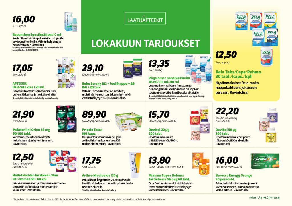 Apteekissamme on vaihtuvia tarjouksia. Alla olevat tarjoukset ovat voimassa kuukauden loppuun saakka tai niin kauan kuin tarjoustuotteita riittää. Katso kaikki tarjoukset tästä »
